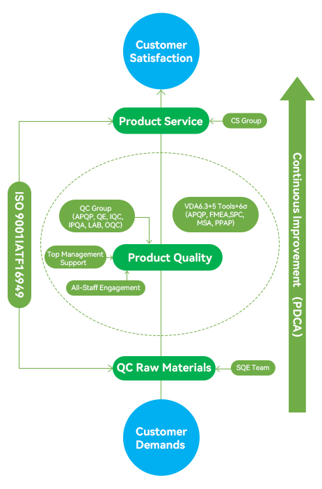We strictly inspect and control the quality of all outgoing products according to international and customer standards. Moreover, we follow the quality performance of products after delivery, and adopt rapid and effective improvements to resolve any problems of abnormal quality raised by customer.